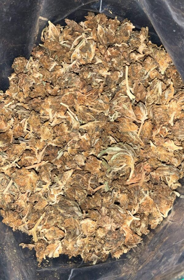 - Texture: Small, piecey nugs with a frosty layer of tiny crystal trichomes.