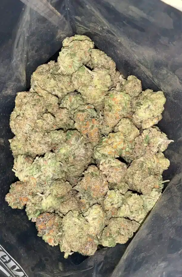 - Color: Light green buds accented with bright orange hairs and a frosty coat of snowy trichomes.