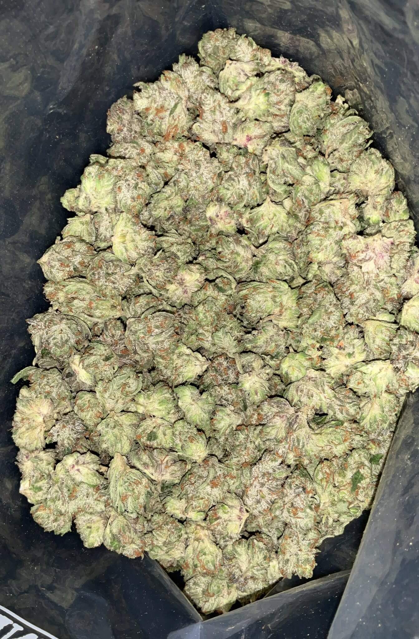 - Texture: Slightly fluffy, resinous, and coated in thick, frosty white trichomes.