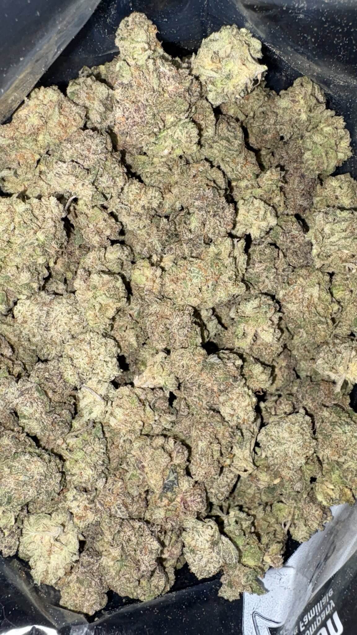 - Color: Forest green, medium-sized buds with thin yellow-orange hairs and a dusting of milky white trichomes.