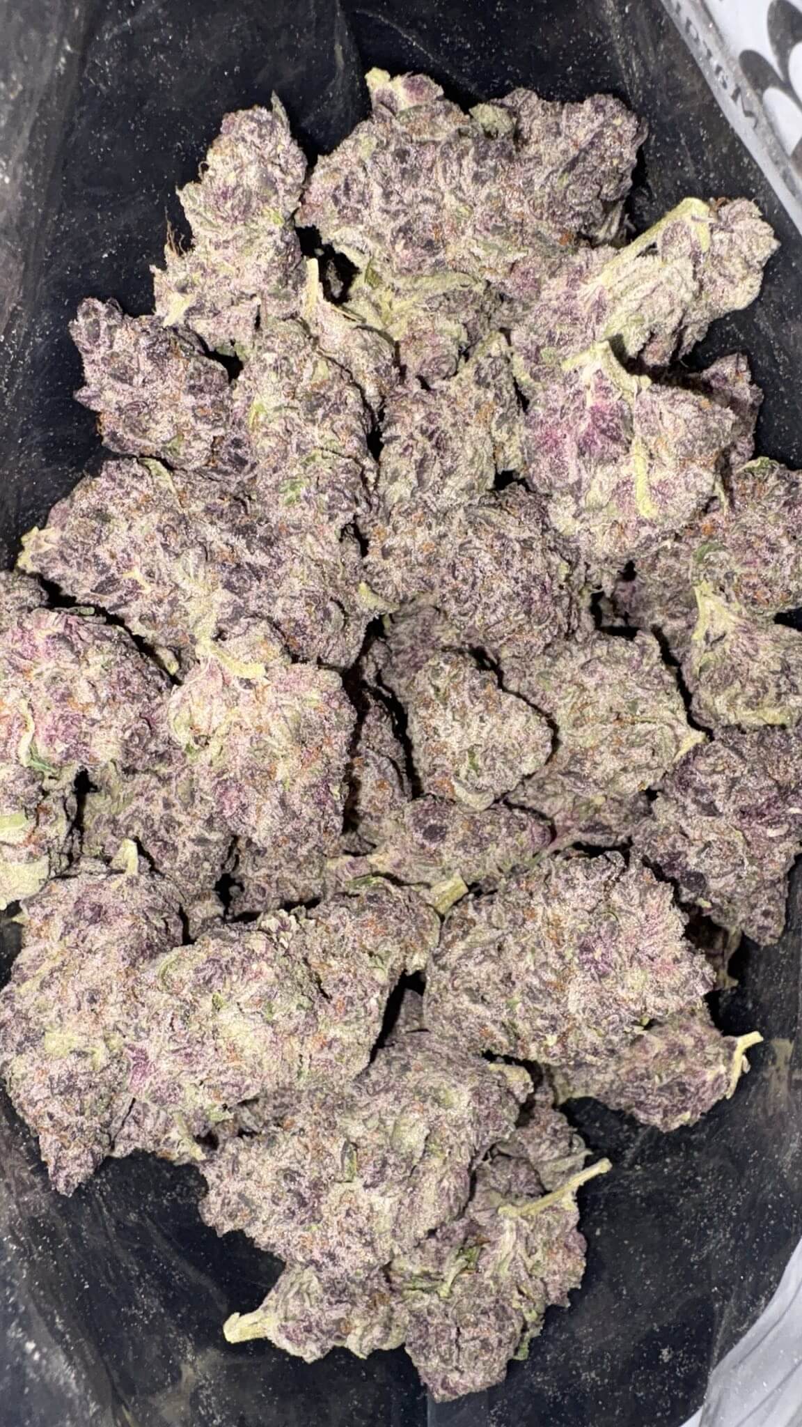 - Colour: Forest green, grape-shaped buds with dark sugar leaves, fiery orange hairs, and a heavy frost of chunky white trichomes.