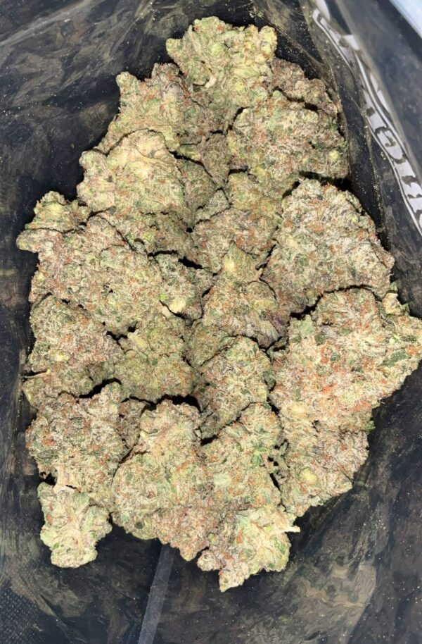 - Color: Dark forest green with purple undertones, fiery orange pistils, and a frosty blanket of sandy white trichomes.