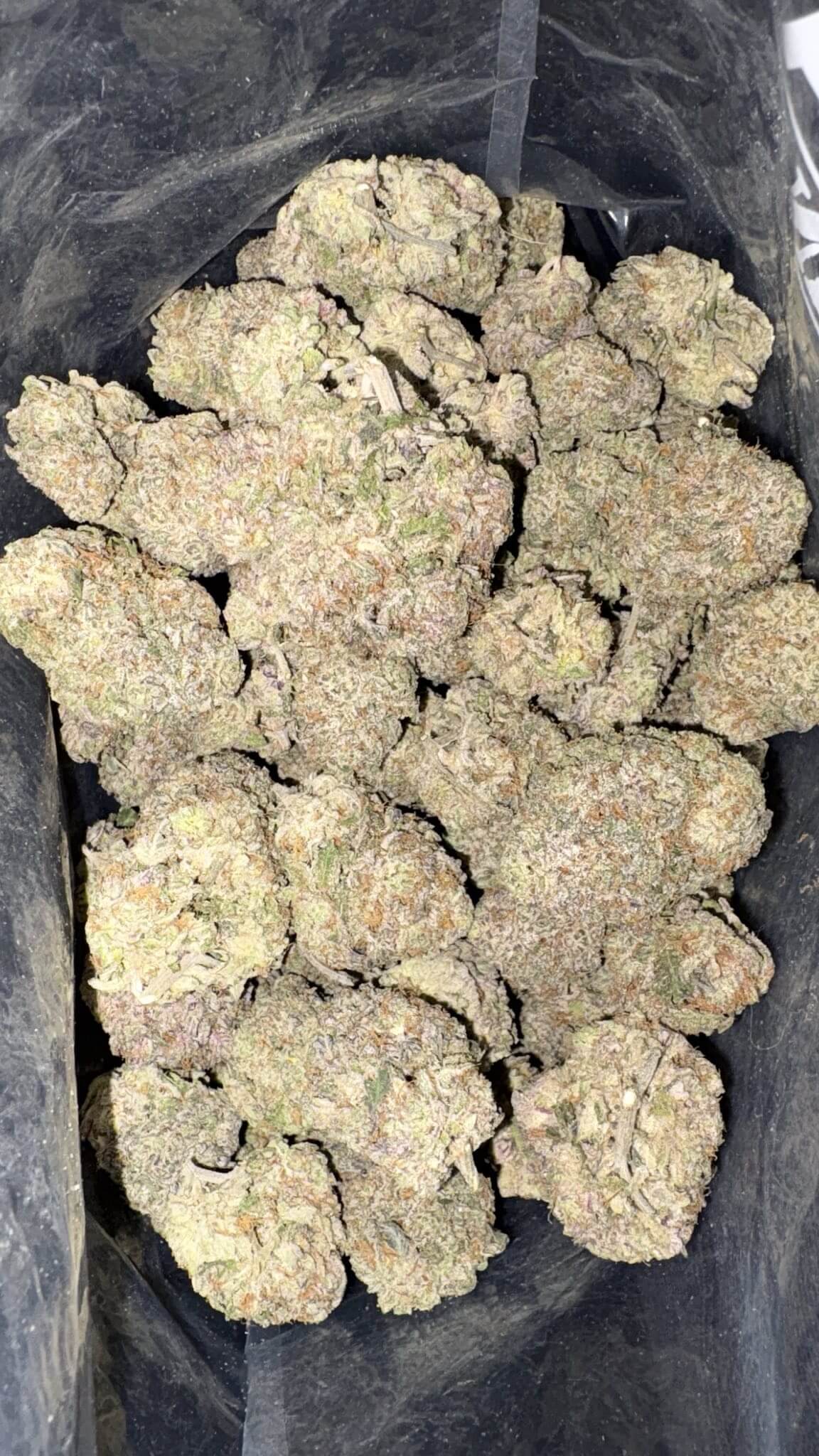 - Colour: Triangle-shaped olive green buds with super thin orange hairs and a glistening layer of icy white trichomes.