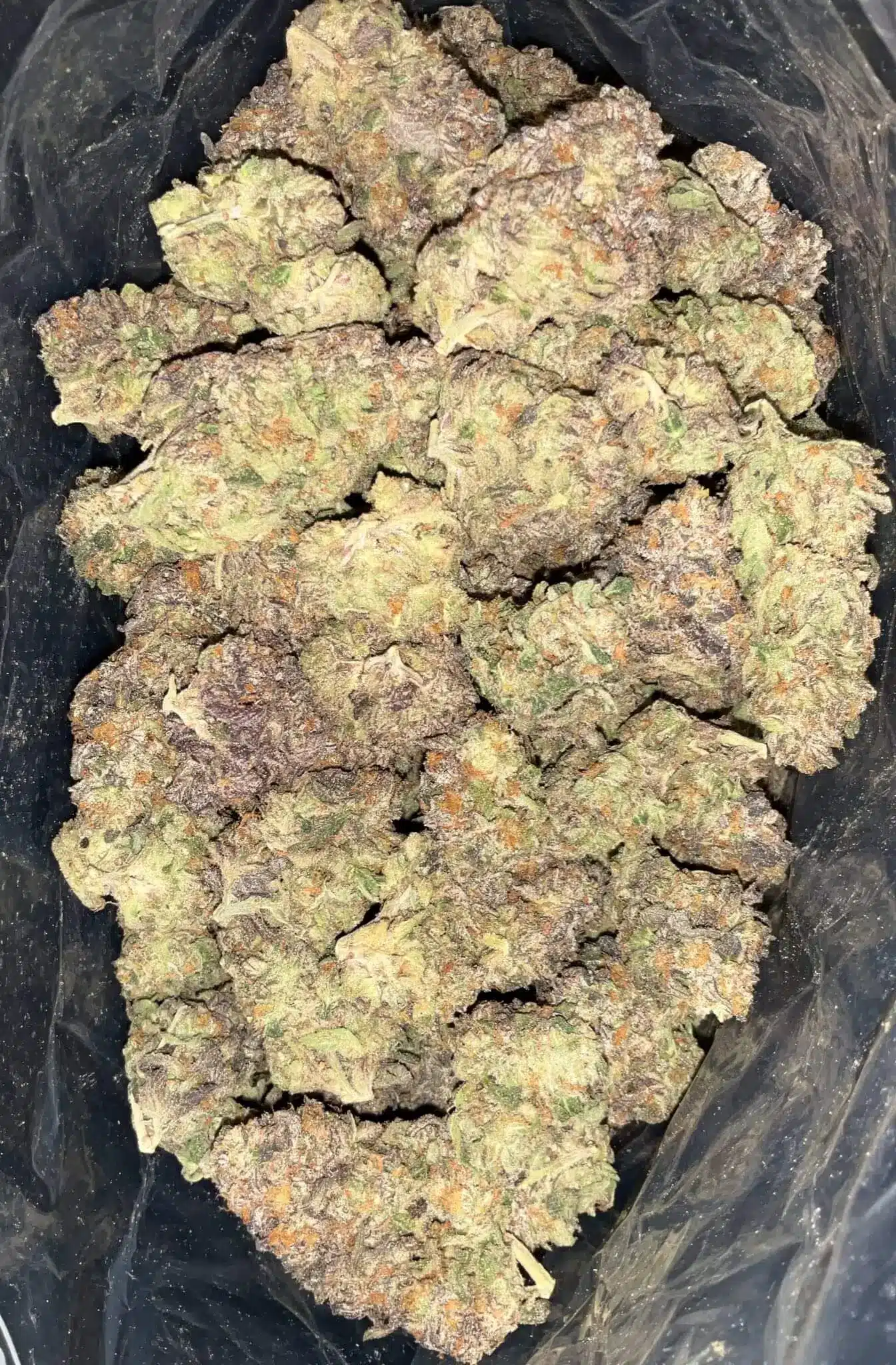 This AAAA flower showcases dense, resin-coated buds with purple hues, orange pistils, and frosty trichomes. Its sticky texture and vivid coloration highlight its premium craft cultivation and high terpene concentration.