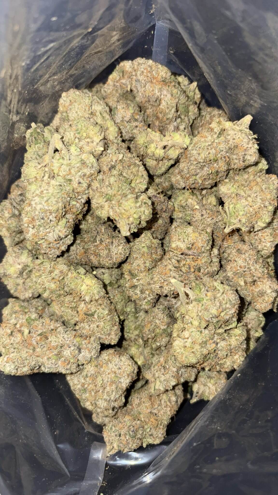 - Color: Bright emerald-green buds with streaks of purple, fiery orange hairs, and a sparkling coat of milky-white trichomes.