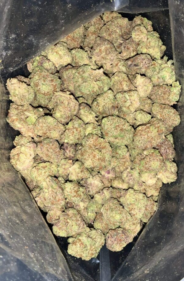 - Colour: Bright emerald green buds with pink-tinted trichomes and fiery orange hairs.