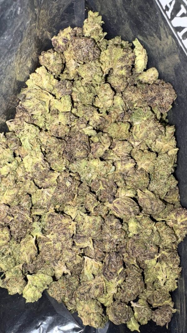 - Color: Dark olive green spade-shaped buds with deep purple undertones, fiery orange hairs, and a thick frost of trichomes.