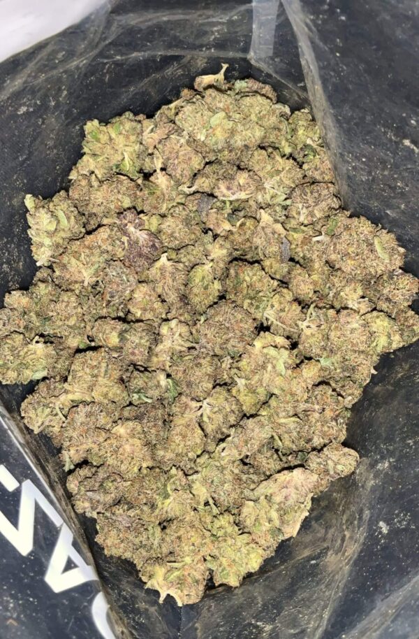 - Color: Dense, dark olive-green nugs with purple undertones, fiery orange hairs, and frosty purple trichomes.