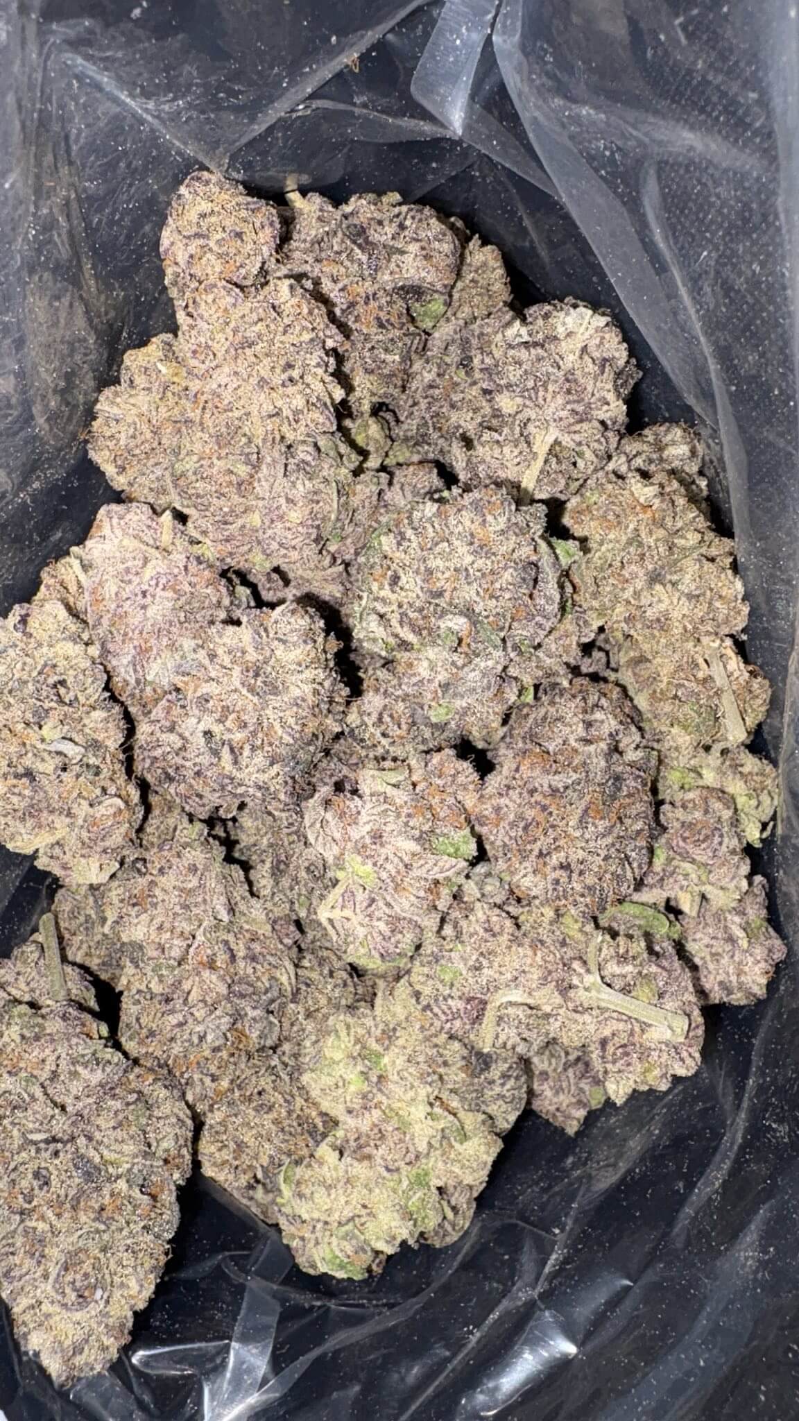 - Color: Dense, rounded dark olive green buds with deep purple hues, thin orange hairs, and chunky golden-white trichomes.