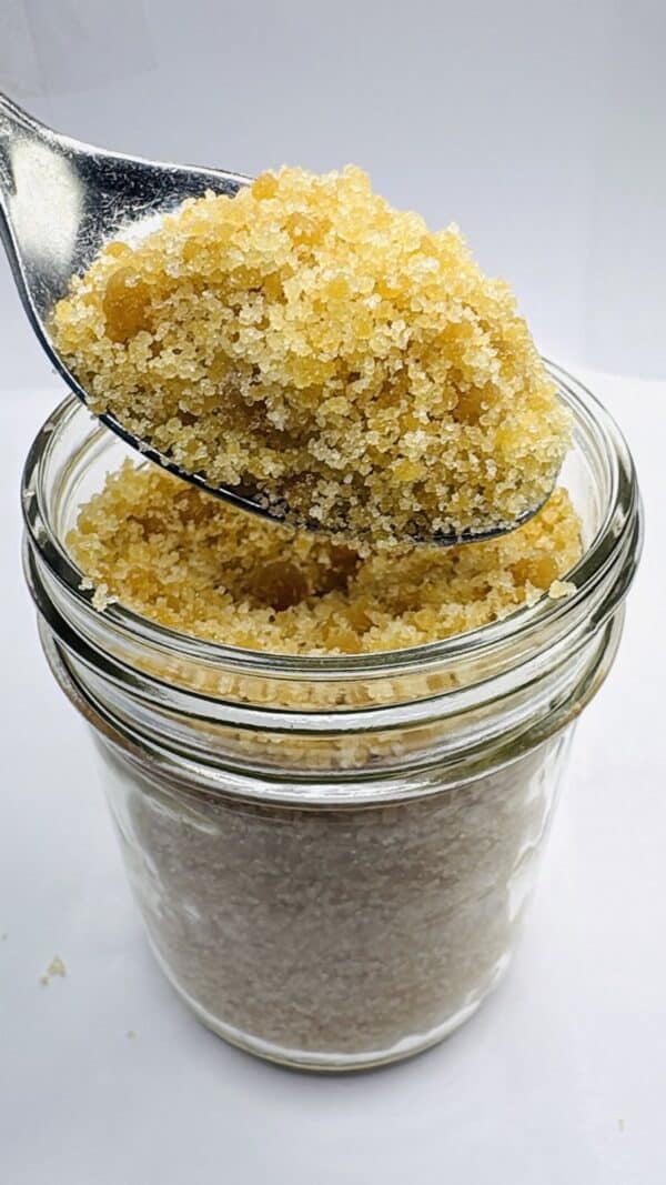 - Color: Golden sugar wax layered with sparkling white crystalline THCa.