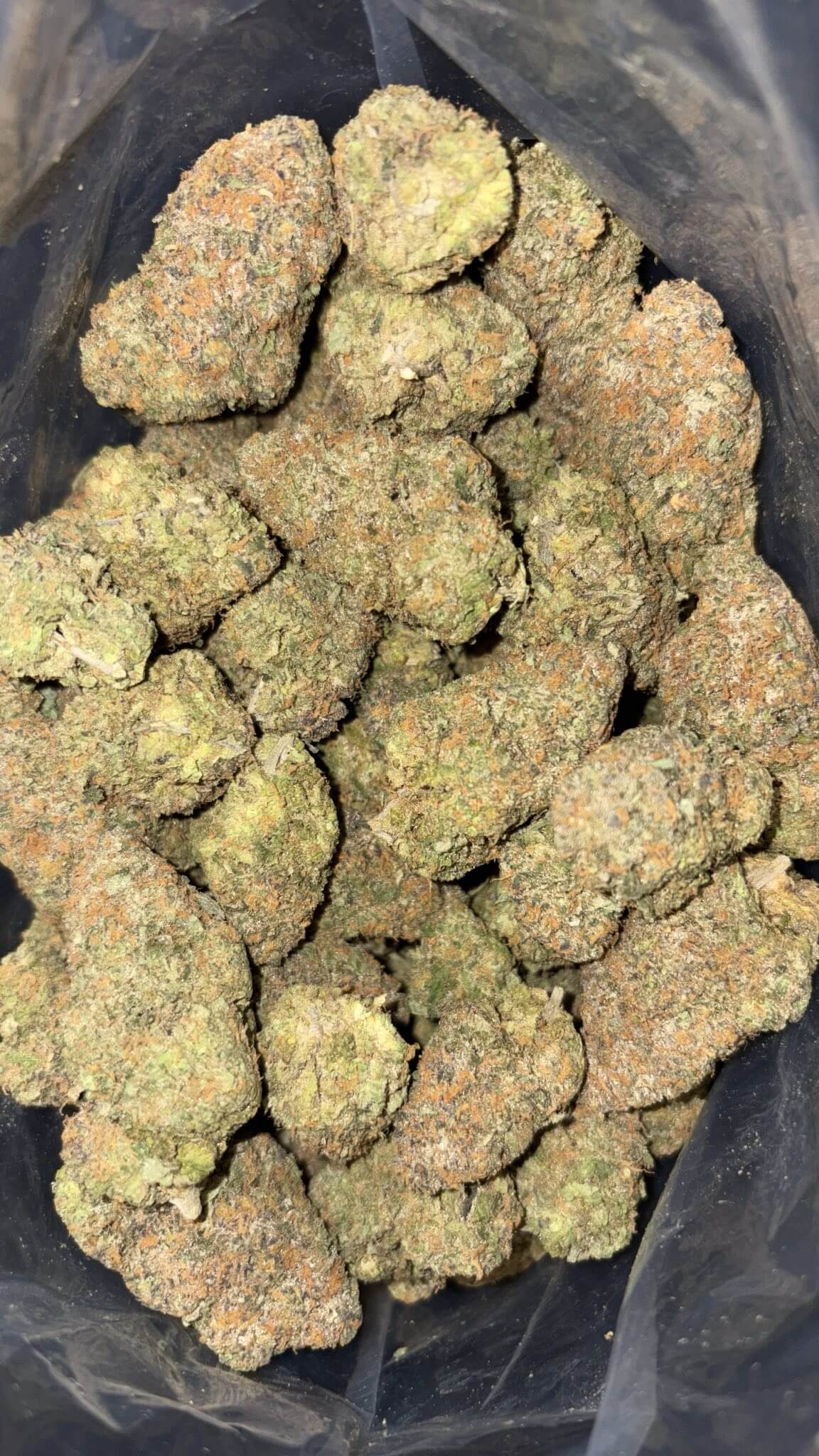 - Color: Small, dense heart-shaped nugs in deep olive green, accented with dark purple hues, bright orange hairs, and frosty, purple-tinted white crystal trichomes.