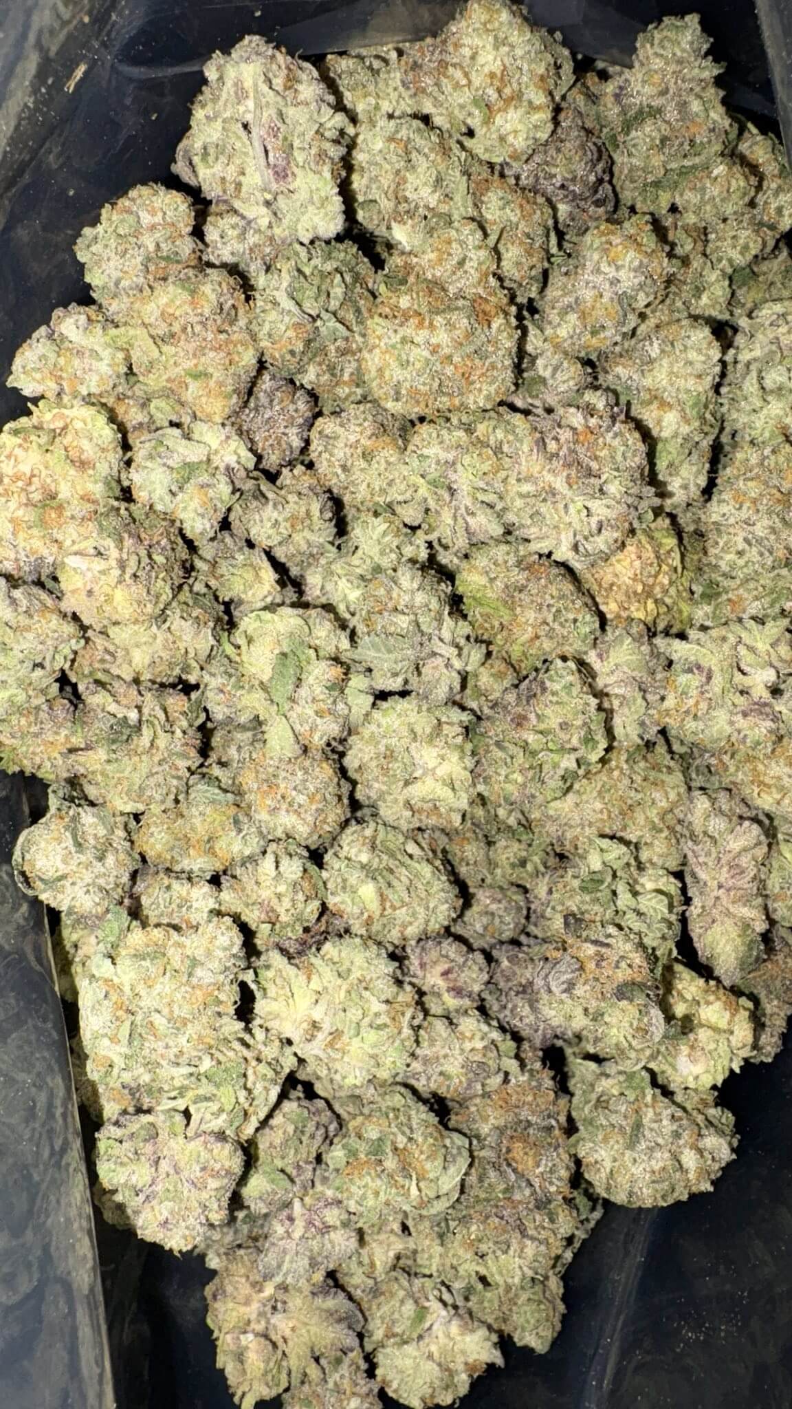 - Color: Dense, olive green buds with vibrant red-orange hairs and a shimmering layer of milky trichomes.