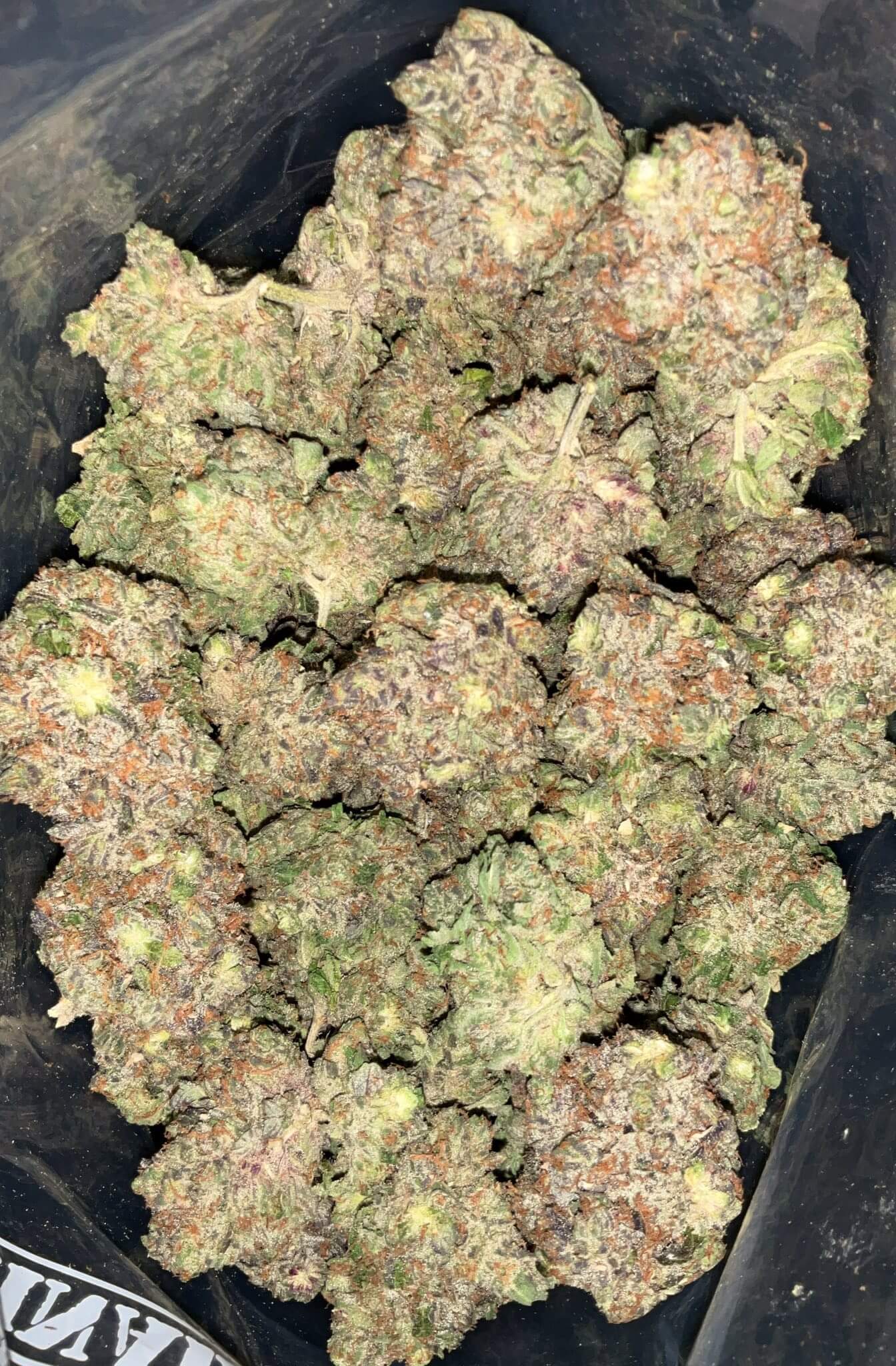 - Colour: Dark forest green buds with rich purple undertones, fiery orange hairs, and a thick frost of sandy white trichomes.