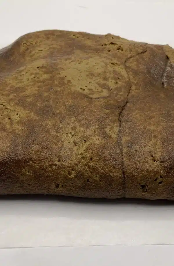 This hash showcases a dark brown to black exterior with a soft, pliable, and slightly sticky texture that becomes more workable when warmed. Inside, lighter golden tones reveal its purity and potency, making it a standout among concentrates.